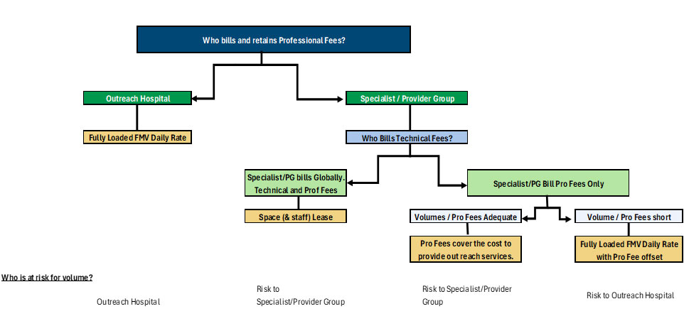 When the provider of the specialist bills globally (retaining both professional and technical fees), the group assumes the risk for patient volumes. In this case, the outreach facility generally pays an FMV lease rate for space and staffing. When the provider group retains professional fees, and the outreach site retains technical fees, consideration should be given to whether the projected professional fees are adequate to cover the fully loaded costs of the specialist’s services. Suppose professional fee revenue is projected to be short of the fully loaded cost to provide the specialist’s services. In that case, compensation is typically structured as a fully loaded FMV daily rate offset by and trued up to actual professional fees. Under this structure, the outreach facility is at risk for patient volumes and payer mix.